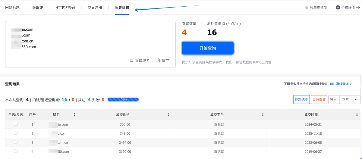 2、新增「历史价格」查询,该功能为您提供域名在主流交易平台的公开价格记录。输入域名,即可查询最近一次交易的价格、时间等信息。