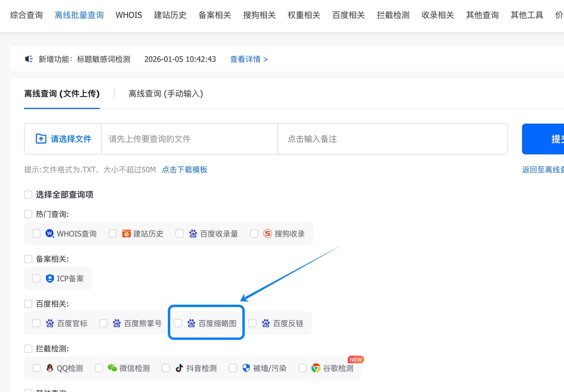 1、离线查询功能现已支持「百度缩略图」项目,助您轻松应对批量检查需求。