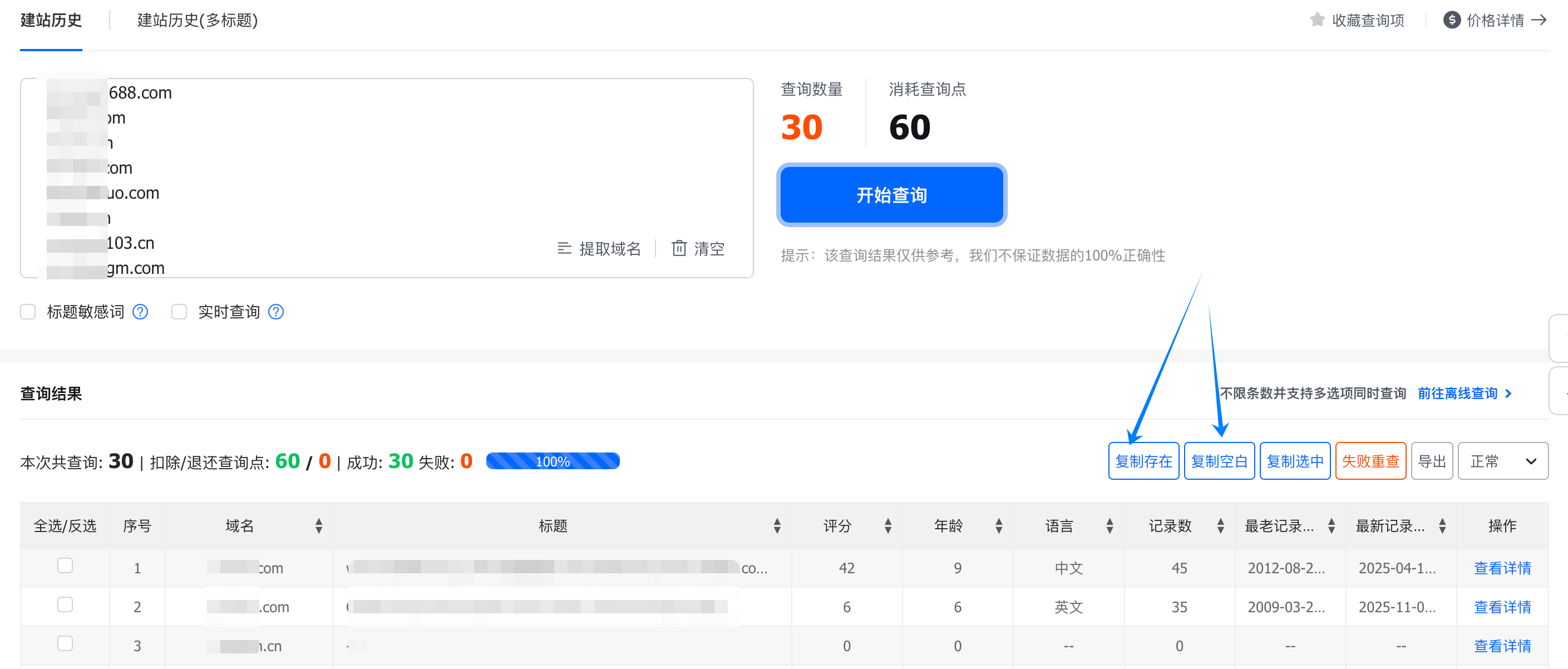 2、建站历史,增加「复制存在、复制空白」的功能,一键复制您需要的域名。